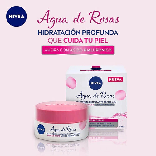 BENEFICIOS - 48 horas de hidratación profunda - Revitaliza la piel - Piel radiante y saludable - Envase 50% reciclado - Apta para todo tipo de piel COMPOSICIÓN Aqua, Glycerin, Alcohol Denat., Cetearyl Alcohol, Distarch Phosphate, Dimethicone, Glyceryl Stearate Citrate, 1,2-Hexanediol, Caprylic/Capric Triglyceride, Dibutyl Adipate, Myristyl Myristate, Octyldodecanol, Dicaprylyl Carbonate, Cetearyl Isononanoate, Ammonium Acryloyldimethyltaurate/VP Copolymer, Phenoxyethanol, Carbomer, Trisodium EDTA, Sodium Hydroxide, Rosa Damascena Flower Water, Sodium Hyaluronate, Potassium Sorbate, Sodium Benzoate, Sorbic Acid, Linalool, Geraniol, Citronellol, Limonene, Methyl Benzoate, Tocopherol, Parfum, CI 16035. MODO DE USO 1) Limpiar el rostro con Agua micelar bifásica NIVEA Rose Care, Leche y tónico micelar 2 en 1 NIVEA Rose Care y Gel limpiador micelar NIVEA Rose Care 2) Aplicar NIVEA Rose Care Crema facial hidratante en gel todas las mañanas y noches 3) Evitar el contacto directo con los ojos PRESENTACIÓN 50 ml